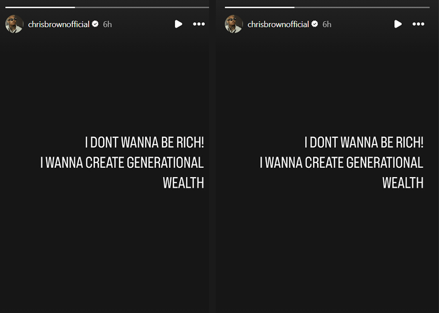 Kupitia Instastory yake Chris Brown ameandika “I don’t wanna be rich, I wanna create generational wealth.” kwamba hatakikuwa tajiri bali anataka kutengeneza kizazi cha utajiri.